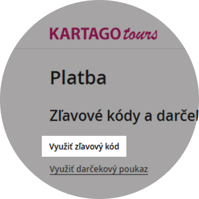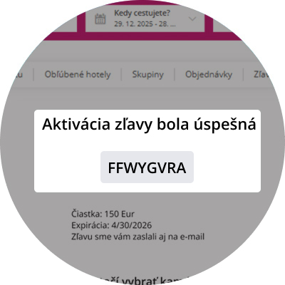 Počas online objednávky v košíku v kroku „Platba“ kliknite na „Pridať zľavový kód“, vložte ho a potvrďte. Celková cena zájazdu sa po zadaní kódu okamžite zníži.